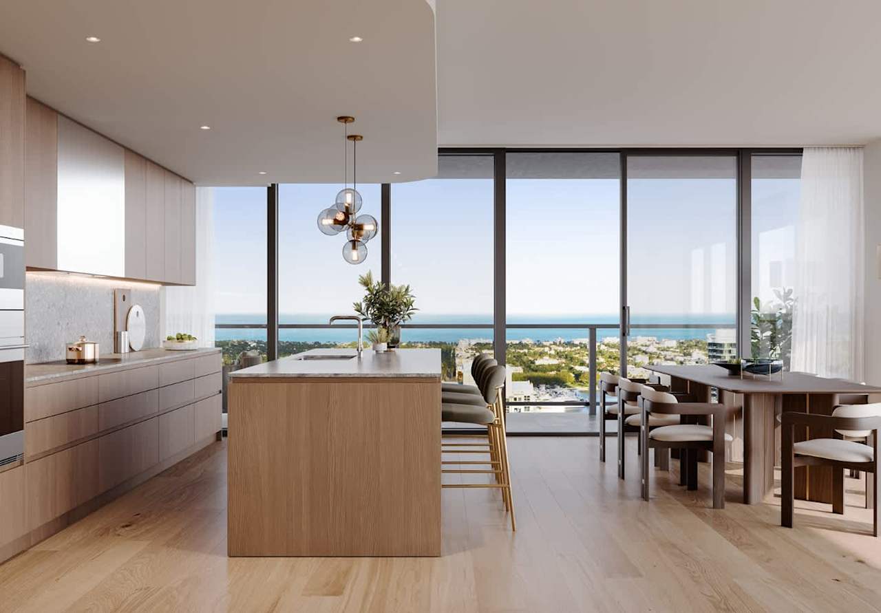 Beautifully appointed, breezy spaces for socializing and relaxing on the amenity level will include indoor and outdoor lounges and a terrace with a swimming pool overlooking the stunning Palm Beach coastline. Residents will be able to sip classic cocktails and fine wines at the bar on the terrace and enjoy poolside food and beverage service.